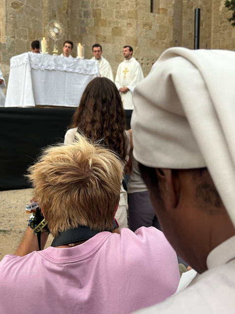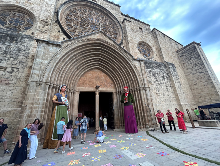 En la jornada dominical muchos comparten misa. Escuchan, oran. A ratos de pie, a ratos de rodillas. Otros esperan afuera el recorrido y la danza final de los cabezones Marieta y Joan, dirigida por los giganters de Sant Cugat.