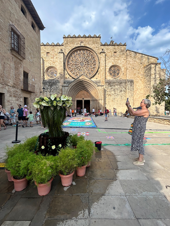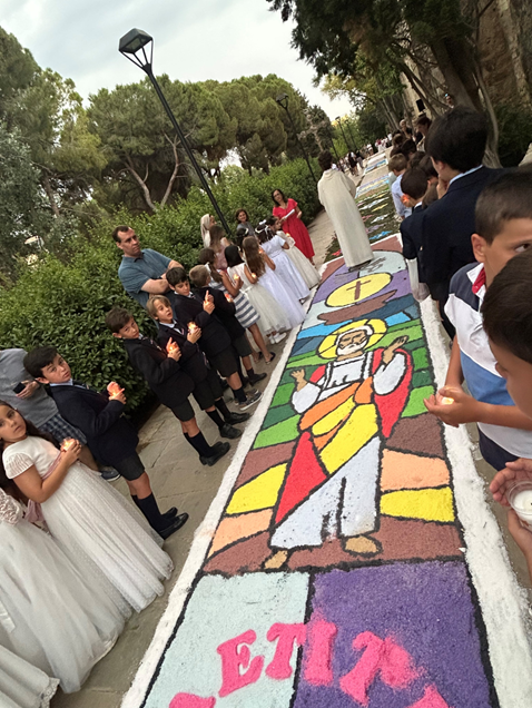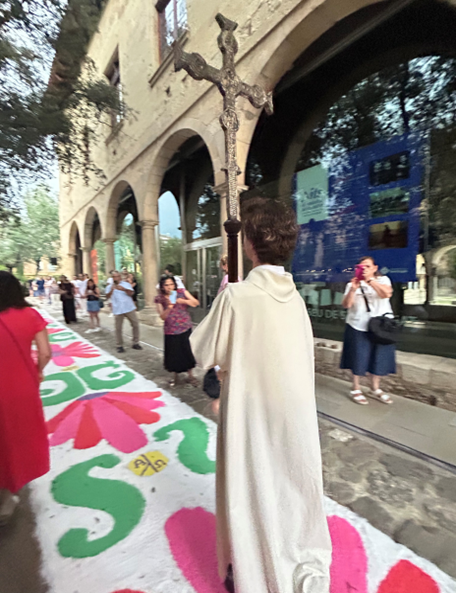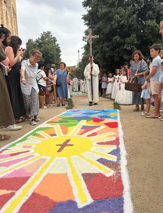 La fiesta litúrgica en Sant Cugat incluye la Procesión por 117 metros de alfombras de sal multicolor que rodean el espacio del Monasterio, una antigua abadía benedictina y construcción principal de la ciudad. Las imágenes icónicas del camino, con flores y adornos naturales, fueron diseñadas por varios grupos de la Parroquia.